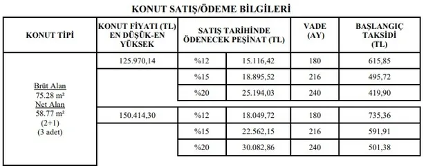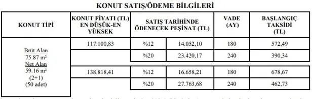 Tokat Merkez Dedeli Mahallesi'nde ise 27 konut 165 bin liradan başlayan fiyatlarla alıcısını bekliyor. 31 Aralığa kadar başvuruların yapılabileceği konutların en düşük taksit tutarı 691 lira.