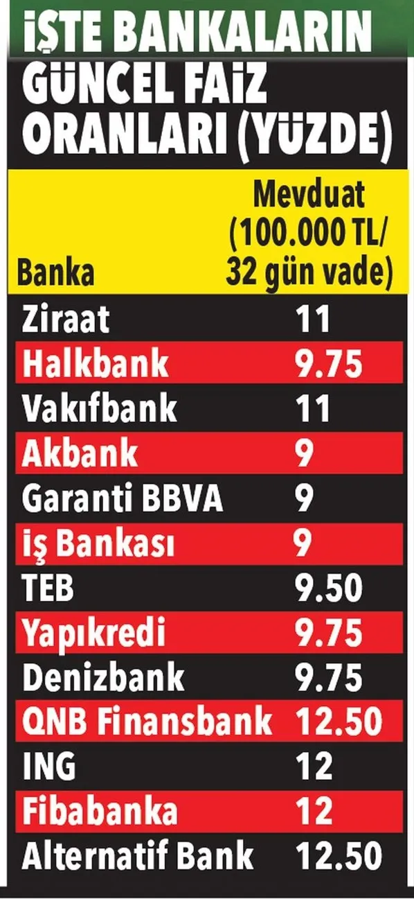Merkez Bankası verilerine göre de mevduatlara 1 aya kadar vade için verilen ortalama faiz 7 Ağustos haftasında yüzde 7.34'ken, 4 Eylül haftasında da yüzde 9.22 oldu. 3 aya kadar vadeli mevduat faizleri ise yine 7 Ağustos haftasında yüzde 8.70'ken, 4 Eylül haftasında yüzde 11.76'ya yükseldi. Tabi bu oranlar ortalama. Özel bankalar daha yüksek oranlar sunuyor.
