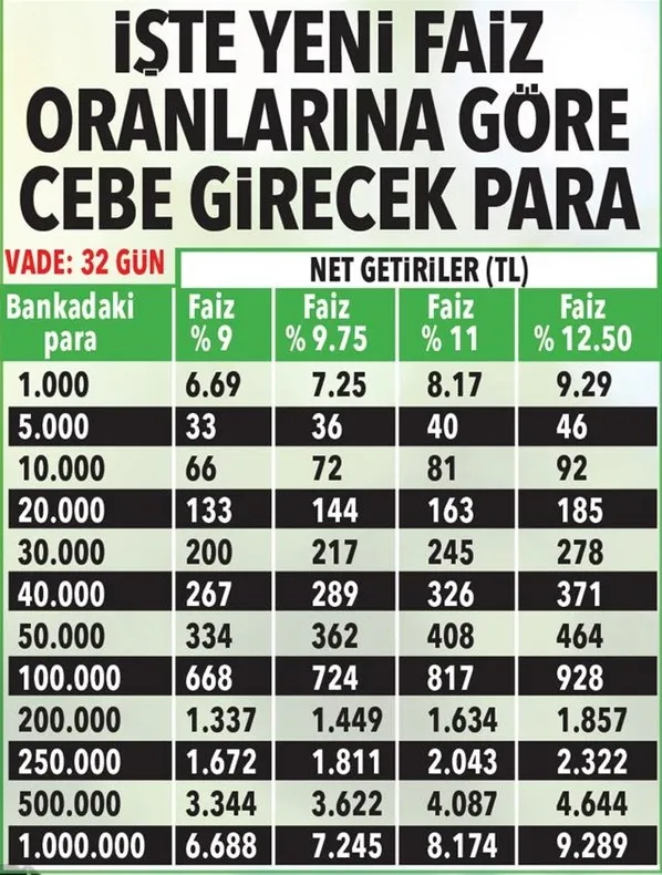 Merkez Bankası'nın aldığı önlemlerle birlikte ağustos başında yüzde 6'larda olan TL mevduat faizleri özel bankalarda önce yüzde 10'a şimdi de yüzde 12.50'lere kadar yükseldi. Örneğin faiz yüzde 10 iken 32 gün vade ve 100 bin lirada 743 lira net gelir elde eden biri, yüzde 12.50 olan faizle kazancını 185 lira daha artarak 928 liraya yükseltmiş oluyor.