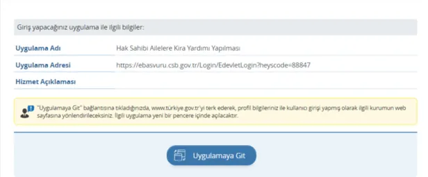 e-Devlet'in "Hak Sahibi Ailelere Kira Yardımı Yapılması" bölümünden başvuru işlemi gerçekleştiriliyor. Vatandaşların öncelikle T.C. kimlik numaraları ve şifreleri ile sisteme giriş yapmaları gerekiyor. Daha sonra açılan pencere üzerinden "Uygulamaya Git" sekmesine tıklayınız.