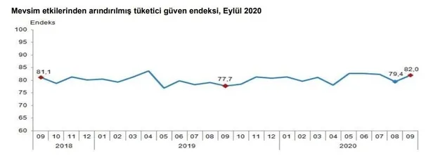 TÜİK ve Türkiye Cumhuriyet Merkez Bankası iş birliğiyle yürütülen "Tüketici Eğilim Anketi" sonuçlarından hesaplanan mevsim etkilerinden arındırılmış tüketici güven endeksi, eylülde geçen aya göre yüzde 3,2 arttı. Ağustos ayında 79,4 olan endeks değeri eylülde 82'ye çıktı.