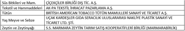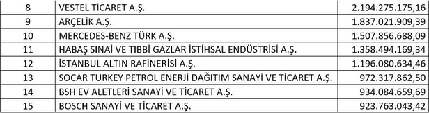 2 milyar 247 milyon dolarla Kibar Dış Ticaret 5'inci, 2 milyar 231 milyon dolarla TGS Dış Ticaret 6'ıncı, 2 milyar 210 milyon dolarla Tofaş Türk Otomobil Fabrikası 7'inci sırayı aldı. Vestel Ticaret A.Ş 2 milyar 194 milyonla 8'inci, Arçelik A.Ş 1 milyar 837 milyonla 9'uncu olurken 1 sıra yükselen Mercedes Benz Türk A.Ş. ise 1 milyar 507 milyonluk ihracatla 10'uncu sırada yerini aldı.