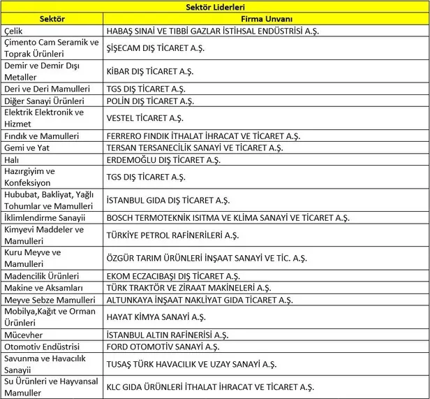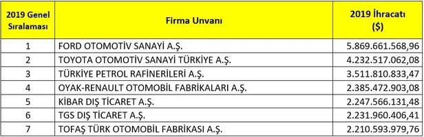 Araştırma sonuçlarına göre Ford Otomotiv Sanayi A.Ş., 5 milyar 869 milyon dolarlık ihracatla liderliğini korurken, Toyota Otomotiv Sanayi Türkiye A.Ş., 4 milyar 232 milyon dolarla ikinci, Türkiye Petrol Rafinerileri A.Ş. ise 3 milyar 511 milyon dolarla üçüncü sırada yer aldı. Bir önceki yıl 9'uncu sırada bulunan Oyak-Renault Otomobil Fabrikaları A.Ş., 2 milyar 385 milyon dolarlık ihracatla 4'üncü sıraya yükseldi.