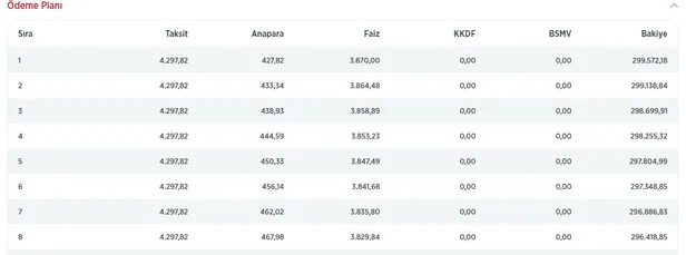 250.00 bin TL 120 ay vade ve 300.000 bin TL 180 ay vade şeklinde örnek hesaplama: