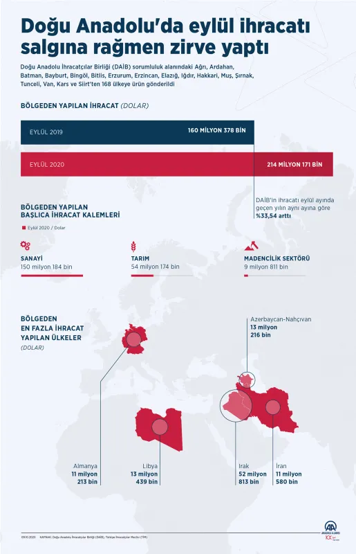 AA muhabirinin, DAİB ve Türkiye İhracatçılar Meclisi (TİM) verilerinden yaptığı derlemeye göre, eylül ayında birliğin sorumluluk alanındaki Ağrı, Ardahan, Batman, Bayburt, Bingöl, Bitlis, Erzurum, Erzincan, Elazığ, Iğdır, Hakkari, Muş, Şırnak, Tunceli, Van, Kars ve Siirt'ten 168 ülkeye ürün gönderildi.