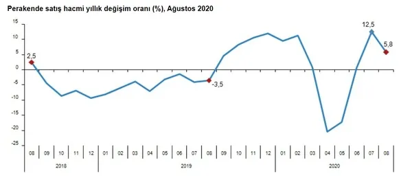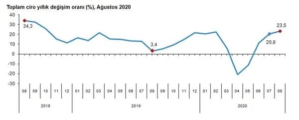 Ağustosta sanayi üretimi yıllık %10,4; perakende satış hacmi %5,8 artarken sektörel ciro endeksi ise yıllık %23,5 yükseldi.