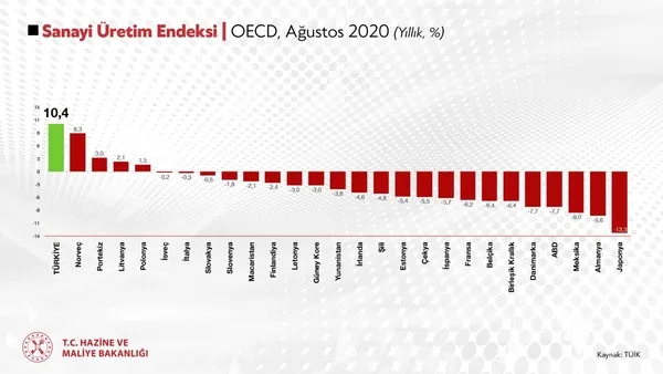 Bakan Albayrak, Twitter hesabından yaptığı açıklamada, "OECD'de 1, dünyada 2'nciyiz. Ağustosta sanayi üretimi yıllık yüzde 10,4; perakende satış hacmi yüzde 5,8 artarken sektörel ciro endeksi ise yıllık yüzde 23,5 yükseldi. İhracat treninin başına üretim lokomotifini getirerek istikrar ve verimlilik vagonlarını milli ekonomi raylarına oturtuyoruz" ifadesini kullandı.