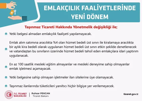 Ticaret Bakanı Ruhsar Pekcan, taşınmaz ticaretine ilişkin yönetmelik değişikliğiyle, emlakçılık faaliyetlerinde hizmet kalitesinin artırılmasını, haksız rekabetin ortadan kaldırılmasını ve kayıt dışılığın önlenmesini amaçladıklarını belirterek, artık yetki belgesi almadan emlakçılık faaliyeti yapılamayacağını ve belgesi bulunmayan işletmelerin ilan sitelerine üye olamayacağını bildirdi.