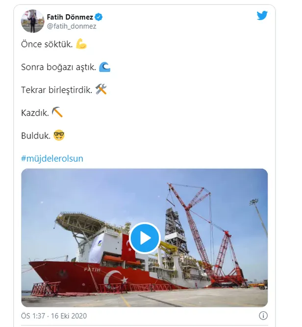 Enerji ve Tabii Kaynaklar Bakanı Fatih Dönmez, Twitter hesabından, Fatih sondaj gemisinin çalışmalarına ilişkin, "Önce söktük, sonra boğazı aştık, tekrar birleştirdik, kazdık, bulduk" açıklamasını yaptı. Bakan Dönmez'in 'müjdeler olsun' etiketi ile paylaştığı görüntüde ise, Fatih sondaj gemisinin söküm işlemleri ardından, Cumhurbaşkanı Recep Tayyip Erdoğan tarafından Karadenize uğurlanması yer aldı. Videoda ayrıca, Cumhurbaşkanı Erdoğan'ın çarşamba günkü grup toplantısında "Cumartesi günü Fatih sondaj gemimize giderek hem çalışmaları bizzat yerine görecek hem de yeni rezerv miktarını açıklayacağız" açıklaması da yer aldı.
