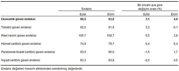 Endeks bu ay, eylüle göre yüzde 4,8 artarak 92,8 değerine ulaştı. Ekonomik güven endeksindeki artış, reel kesim (imalat sanayi), hizmet, perakende ticaret ve inşaat sektörü güven endekslerindeki artışlardan kaynaklandı.