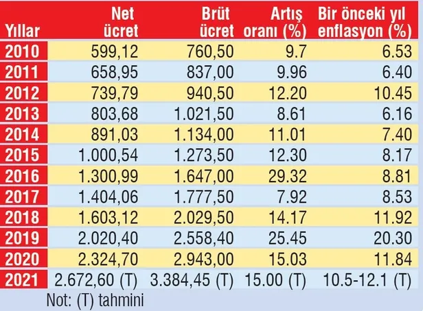 Son 10 yıllık artışlara bakıldığında, 2016'daki yüzde 30'luk artış dışında tüm zamlar bir önceki yılın enflasyonunun 3-5 puan üzerinde gerçekleşmiş durumda. Yeni Ekonomi Programı'nda yıl sonu için enflasyon tahmini yüzde 10.5 olarak yer aldı. Merkez Bankası ise son toplantısında yıl sonu enflasyon beklentisini yüzde 12.1 olarak revize etti.