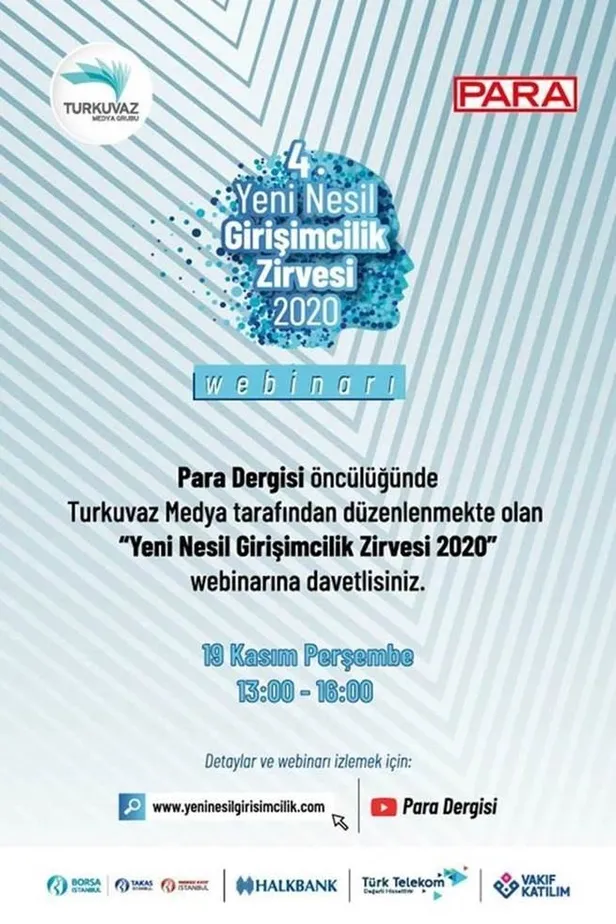 Turkuvaz Medya Grubu ve Para Dergisi tarafından dördüncüsü düzenlenen ve girişimcilik hakkında toplumun her kesiminde farkındalık oluşturarak, inovatif girişimcilerin desteklenmesi, girişimcilik ruhunun yaygınlaştırılmasını amaçlayan "4. Yeni Nesil Girişimcilik Zirvesi" bugün webinar formatında düzenleniyor.