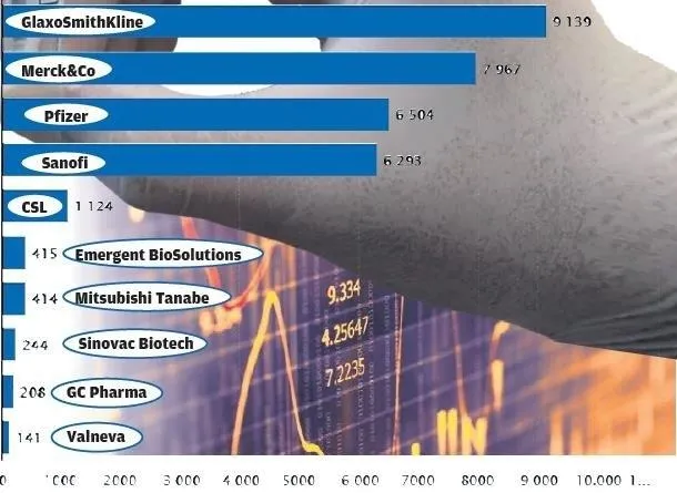 2023'e kadar azalarak 6.8 milyar dolara inse de yine de milyar dolarlık bir pazar... Örneğin Kovid-19 için model alınan grip aşısı yılda yaklaşık 4-5 milyar dolar ciro bırakıyor. Ağırlıklı olarak da Sanofi, GlaxoSmithKline ve Seqirus firmaları bu geliri paylaşıyor.
