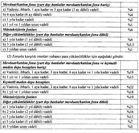 Türk Lirası zorunlu karşılık oranı, vadesiz, 1 ay ve 3 aya kadar vadeli hesaplar için yüzde 4'ten yüzde 6'ya çıkarıldı. 6 aya kadar vadeli hesaplar için zorunlu karşılık oranı yüzde 4'te, 1 yıla kadar vadeli hesaplar için yüzde 2'de, 1 yıl ve 1 yıldan uzun vadeli hesaplar için yüzde 1'de tutuldu.