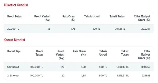 Yıllık Maliyet oranı faiz tahsis ücreti ve vergiler temel alınarak hesaplanmıştır. 35 yaş için hesaplanan 1 yıllık ortalama sigorta masrafı tüketici kredisi için 39,67-TL, konut kredisi için 108,19.-TL'dir.