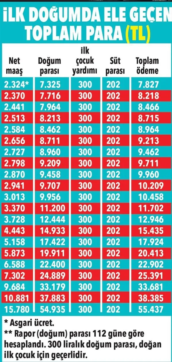 Çalışan annelere analık izninin olduğu 112 günlük süre için doğum (rapor) parası, ödeniyor. En düşük tutar 7 bin 325 lira. Para annenin adına açılan Ziraat Bankası hesabına yatıyor. Paranın yatıp yatmadığını doğum izniniz biter bitmez 'turkiye.gov.tr'den kontrol edebilirsiniz.