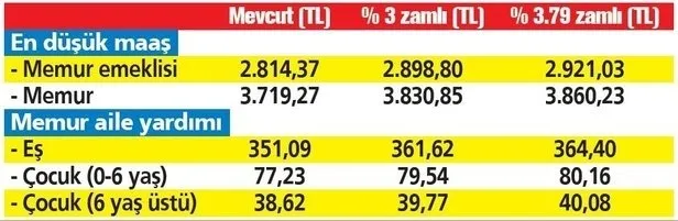 Ocak artışı yüzde 3 olursa en düşük maaş; memurlarda 3 bin 719 liradan 3 bin 830 liraya, memur emeklilerinde 2 bin 814 liradan 2 bin 898 liraya yükselecek. Eğer oran yüzde 3.79'a yükselirse, en düşük memur maaşı 3 bin 860, memur emeklisi maaşı da 2 bin 921 liraya ulaşacak.