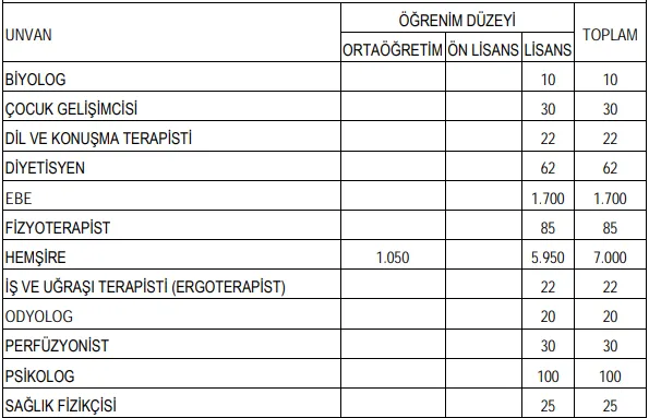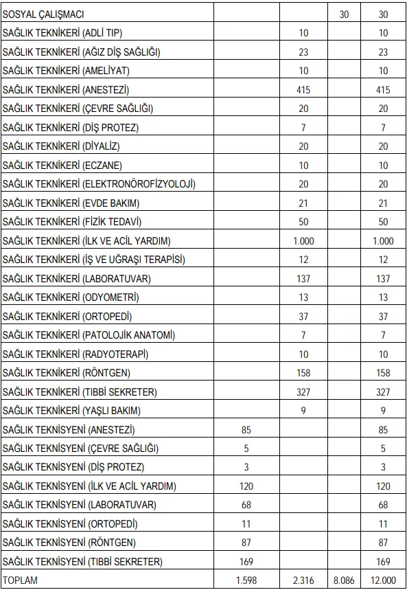 Sağlık Bakanı Fahrettin Koca, Twitter hesabından yaptığı açıklamada, Sağlık Bakanlığının taşra teşkilatı hizmet birimlerinde istihdam edilmek üzere, KPSS puanına göre ÖSYM tarafından yapılacak merkezi yerleştirme ile 12 bin sözleşmeli sağlık personeli alacaklarını duyurmuştu.Alım yapılacak personelin il ve sağlık tesisi dağılımının yer aldığı listelerin ÖSYM Başkanlığına teslim edildiğini belirten Koca, "7 bini hemşire, 1700'ü ebe ve 2 bin 864'ü sağlık teknikeri/teknisyeni olmak üzere psikolog, sosyal çalışmacı, biyolog, odyolog, çocuk gelişimcisi, diyetisyen, fizyoterapist, iş ve uğraşı terapisti, dil ve konuşma terapisti, perfüzyonist ve sağlık fizikçisi unvanlarında alım yapılacak." bilgini paylaştı.