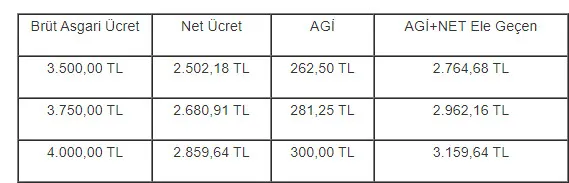 İşçi kesiminin beklemiş olduğu rakamın en düşüğünün açıklanması halinde net asgari ücret AGİ dahil 2 bin 750 TL olacaktır, brüt ise 3 bin 846 TL'ye çıkmış olacaktır.