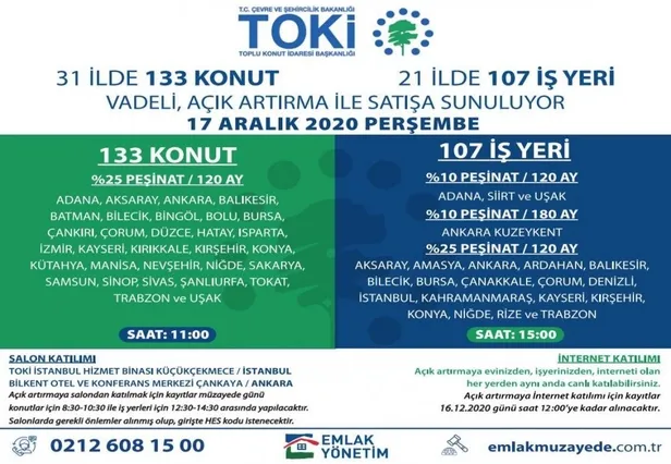 Çevre Bakanlığı, TOKİ Başkanlığı konut ve işyeri satışlarına ilişkin ilanına başvuru yapacaklar için "Toplu Konut İdaresi Başkanlığı tarafından 31 ilde 133 konut ve 21 ilde 107 iş yeri açık artırma ile satılacak. Müzayede, 17 Aralık 2020 tarihinde TOKİ İstanbul Hizmet Binası Konferans Salonu Halkalı/İstanbul, Bilkent Otel ve Konferans Merkezi Bilkent /Ankara adreslerinde gerçekleştirilecek" bilgilerini verdi.