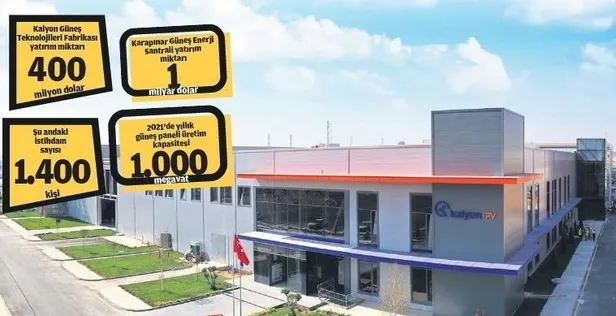 Dünyada Ar-Ge dahil güneş paneli üretim aşamalarını tek çatı altında toplayan entegre bir tesis olan Kalyon Güneş Teknolojileri Fabrikası, üretim kapasitesini 2 katına çıkarma kararı aldı. Üretilen paneller Konya Karapınar'daki GES'in kurulumunda kullanılıyor. Karapınar GES'te kurulu güç 40 megavata ulaşırken, elektrik üretimi de başladı. Kalyon Holding Yönetim Kurulu Başkanı Cemal Kalyoncu, kısa sürede büyük mesafe aldıklarını ve önemli bir başarı sağladıklarını belirterek, "Üç ay önce Cumhurbaşkanımız Recep Tayyip Erdoğan'ın katılımları ile fabrikamız faaliyete başladı. 400 milyon dolar yatırımla kurduğumuz bu fabrikadan önce Türkiye'de sadece, güneş paneli üretim aşamalarının dördüncüsü yani montajı yapılıyordu. Yerli ve milli enerji stratejisi çerçevesinde Türkiye'de ilk kez güneş paneli üretiminin 4 aşaması da tek çatı altında toplandı. Hatta Ar-Ge merkezimizi de aynı çatı altında organize ettik. Bu özelliği ile de dünyadaki tek üretim merkezi olduk. Paneller yüzde 75'in üzerinde yerlilik oranına sahip. Ar-Ge çalışmaları ile bu oranı kısa sürede yüzde 90'lara çıkartacağız" dedi.