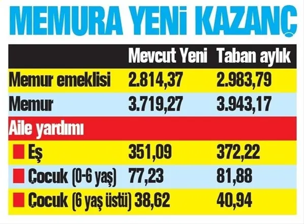 Şu ana kadar gerçekleşen yüzde 6.02'lik zam oranına göre, en düşük memur maaşı 3 bin 719 liradan 3 bin 943 liraya, en düşük memur emeklisi aylığı da 2 bin 814 liradan 2 bin 983 liraya çıkacak. Memurların aile yardımı da artacak. 6 yaş altı 2 çocuğu olan, eşi çalışmayan memur aylık 505,55 lira alıyorken, bu tutar 535,98 liraya ulaşacak