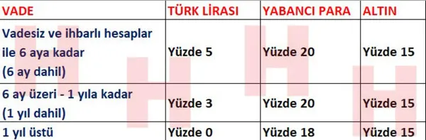 Başkan Recep Tayyip Erdoğan'ın imzasıyla Resmi Gazete'de yayımlanan karara göre mevduatlardan vade süresine göre kesilen yüzde 15'lik stopaj vergisi kısa vadeli hesaplarda yüzde 5'e kadar düşürüldü.