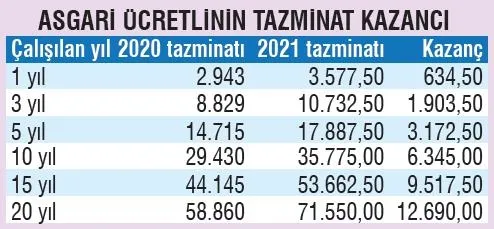 Örneğin; 10 yıldır çalışan bir asgari ücretli işçinin kıdem tazminatı 2020'de 29 bin 430 lira olurken, 2021'de 35 bin 775 liraya çıkacak. Böylece çalışan 6 bin 345 lira daha fazla para alacak.