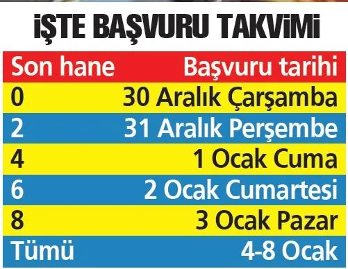 Son hanesi '0' olanlar 30 Aralık Çarşamba, '2' olanlar 31 Aralık Perşembe, '4' olanlar 1 Ocak Cuma, '6' olanlar 2 Ocak Cumartesi, '8' olanlar 3 Ocak Pazar günü başvurabilecek.