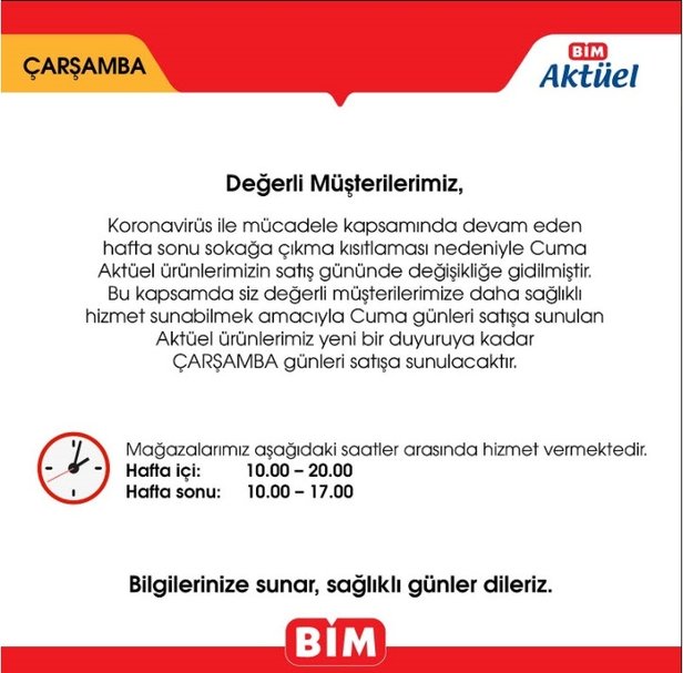 BİM'in internet sitesinde "Değerli Müşterilerimiz, Koronavirüsle mücadele kapsamında devam eden hafta sonu sokağa çıkma kısıtlamsaı nedeniyle Cuma Aktüel ürünlerimizin satış gününde değişikliğe gidilmiştir. Bu kapsamda siz değerli müşterilerimize daha sağlık hizmet sunmak amacıyla Cuma günleri satışa sunulan Aktüel ürünlerimiz yeni bir duyuruya kadar ÇARŞAMBA günleri satışa sunulacaktır." ifadelerine yer verildi.