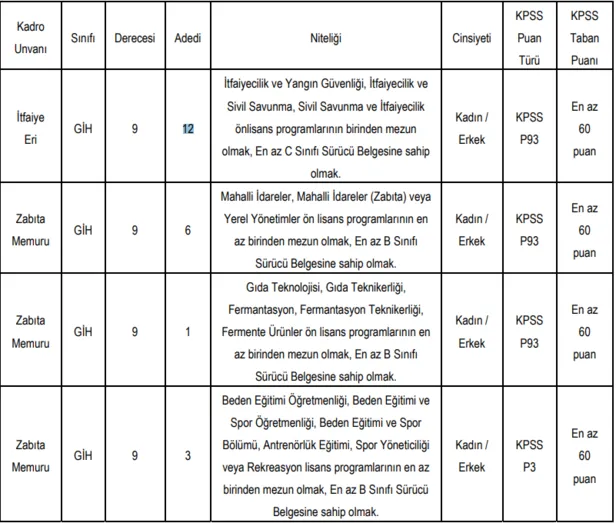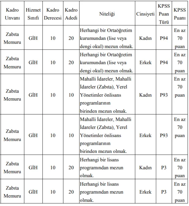 - İlan edilen Zabıta Memuru kadro unvanı için son olarak mezun olunan okul itibariyle öğrenim şartlarını taşımak ve bu öğrenimle ilgili olarak 2020 KPSS (B) grubu sınavına girmiş olmak ve ilgili puan türünden yukarıda tabloda belirtilen asgari puanı almış olmak.