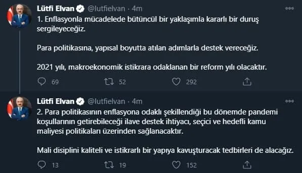 Son dakika haberleri... Hazine ve Maliye Bakanı Elvan "Enflasyonla mücadelede bütüncül bir yaklaşımla kararlı bir duruş sergileyeceğiz." ifadelerini kullandı. Evan Twitter hesabından yaptığı açıklamada, "2021 yılı, makroekonomik istikrara odaklanan bir reform yılı olacaktır." dedi.