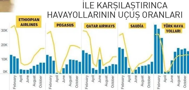 Uzmanlar 2021'de daha da kötü sonuçlar bekliyor. Türk havacılık sektörü ise dünya ile kıyaslayınca en az etkilenenlerden biri olarak öne çıktı. Türk Hava Yolları (THY) dünyada uçuş sayısında Ocak-Ekim döneminde, yüzdesel olarak 2019'a en yakın rakamı yakalayan beşinci havayolu şirketi oldu. THY, aralık ayı itibarıyla uçuş sayısında da Avrupa'nın ikincisi, Pegasus ise 2019'a göre uçuş sayısında oransal olarak yakalayan ikinci havayolu şirketi olmayı başardı.