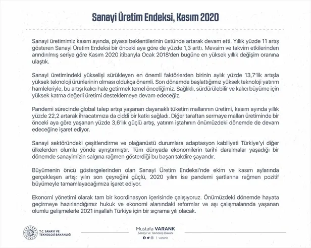 Sanayi ve Teknoloji Bakanı Mustafa Varank, konuya ilişkin yaptığı açıklamada, "Kasım döneminde sanayi üretimini en çok artıran ülkelerden biri olduk. Hedefimiz üretimdeki bu seyri 2021'de de sürdürebilmek. Hayata geçirmeye hazırlandığımız hukuk ve ekonomi alanındaki reformlar ve aşı çalışmalarında yaşanan olumlu gelişmelerle 2021, inşallah Türkiye için bir sıçrama yılı olacak." ifadelerine yer verdi.