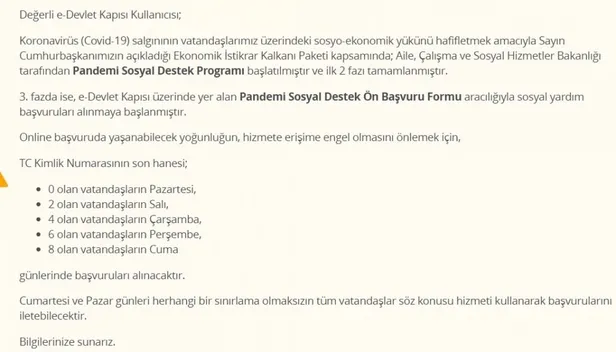 Kimlik numarası sayılarına göre haftanın belli günlerinde yapılan müracaatlar Cumartesi ve Pazar günü sınırlama olmaksızın tüm TC yurttaşlarına açılıyor. 3. fazda pandemi yardım müracaatı alınıyor mu merak edilmeye başlandı. Bir vakittir devam eden pandemi yardım müracaat parası hala sonuçlanmadığı için vatandaşlar tarafından denetlemeler devam ediyor.