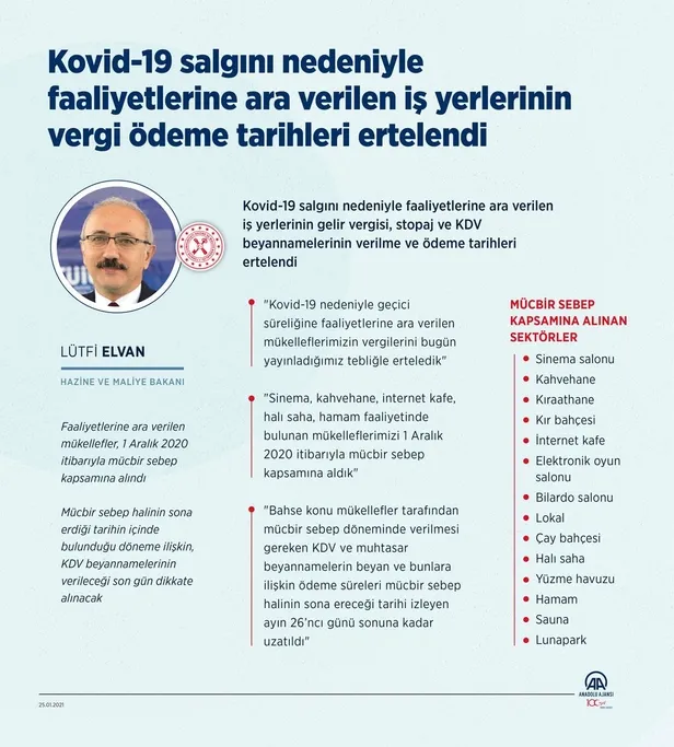 "Sinema salonu, kahvehane, kıraathane, kır bahçesi, internet kafe, elektronik oyun salonu, bilardo salonu, lokal, çay bahçesi, halı saha, yüzme havuzu, hamam, sauna, lunapark faaliyetinde bulunan mükelleflerimizi 1 Aralık 2020 itibarıyla mücbir sebep kapsamına aldık. Bahse konu mükellefler tarafından mücbir sebep döneminde verilmesi gereken katma değer vergisi ve muhtasar beyannamelerin beyan ve bunlara ilişkin ödeme süreleri, mücbir sebep halinin sona ereceği tarihi izleyen ayın 26'ncı günü sonuna kadar uzatıldı."
