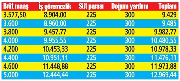 Anneye 9429 TL ödenek: 300-400-600 TL doğum yardımı, en az 8.904 TL ödenek, 225 lira süt parası...