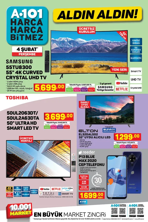 4 Şubat A101 aktüel katalog yine dopdolu. Her hafta birbirinden hesaplı ürünlerin satışa çıktığı A101 marketlerinde yer alacak ürünler katalog vasıtasıyla tanıtılıyor. 4 Şubat A101 aktüel ürünler kataloğunda bu hafta; Samsung ve Elton marka televizyonların yanı sıra; Reeder akıllı cep telefonu dikkat çekiyor.