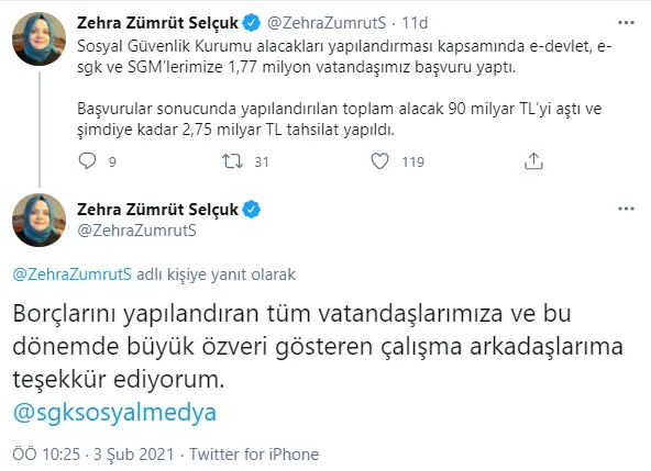 Selçuk, Twitter hesabından yaptığı açıklamada "Sosyal Güvenlik Kurumu alacakları yapılandırması kapsamında e-Devlet, e-SGK ve SGM'lerimize 1,77 milyon vatandaşımız başvuru yaptı. Başvurular sonucunda yapılandırılan toplam alacak 90 milyar TL'yi aştı ve şimdiye kadar 2,75 milyar TL tahsilat yapıldı. Borçlarını yapılandıran tüm vatandaşlarımıza ve bu dönemde büyük özveri gösteren çalışma arkadaşlarıma teşekkür ediyorum." İfadelerini kullandı.