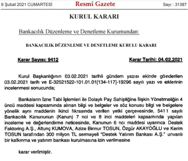 Resmi Gazete'de yer alan açıklamalara göre, bankanın ortakları arasında Destek Faktoring, Altunç Kumova, Azize Binnur Tosun, Özgür Akayoğlu ve Kerim Tosun bulunuyor.