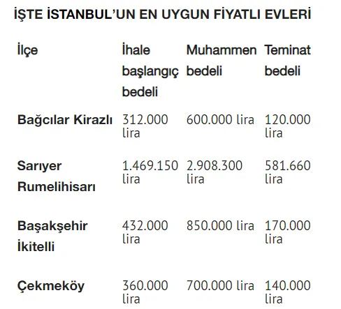 İhaleye çıkan evler için öncelikle bir ekspertiz gerçekleştiriliyor. Evin konumu, özellikleri, bulunduğu yere ilişkin tüm bilgiler aktarıldıktan sonra muhammen bedeli yani şu an satılsa edeceği değer ortaya çıkarılıyor. İhale ise genellikle muhammen bedelin yarısı kadar tutardan başlıyor. Örnek olarak 1 milyon liralık daire ihaleye 550 bin liradan çıkıyor.