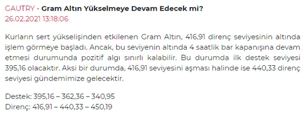 "Gram Altın, ons tarafındaki düşüşe rağmen, USDTRY tarafındaki yukarı tepki sebebiyle, 411 direnci üzerinde tutundu ve 421 ve 424 dirençlerimize ulaştı. Bugün de 411 kısa vadeli ilk kritik destek konumunda.