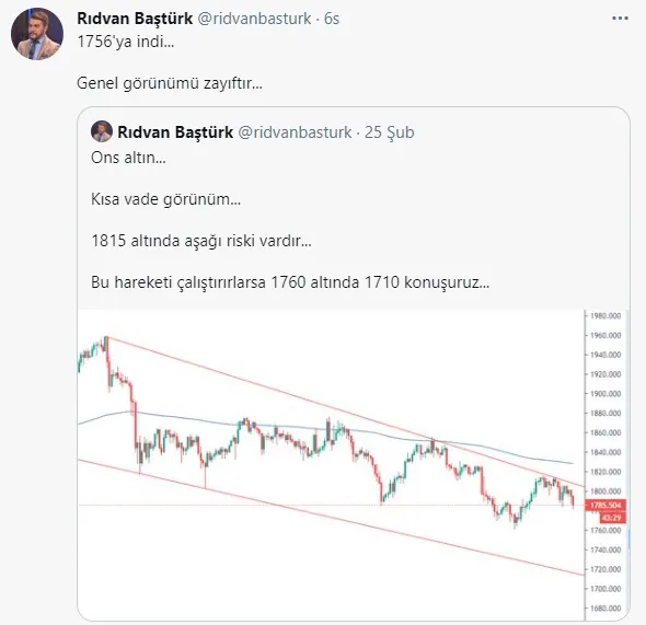 Yatırımcılar altın ne zaman yükselecek, altın düşmeye devam edecek mi sorusuna cevap ararken Stratejist / Özel Fon Yöneticisi Rıdvan Baştürk güncel altın yorumunda, ons altının teknik görünümünde haftalardır değişen bir şeyin olmadığını belirterek tekrar zayıf bölgede olduğunu vurguladı. Baştürk, ons altının 1.756 dolar seviyesinin genel görümünün zayıf olduğunu açıkladı.