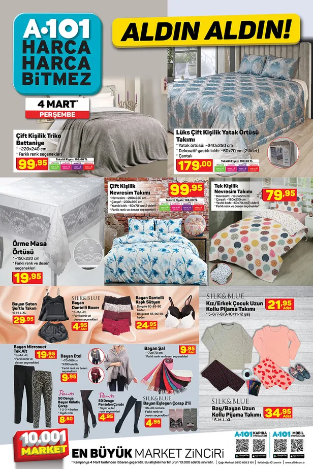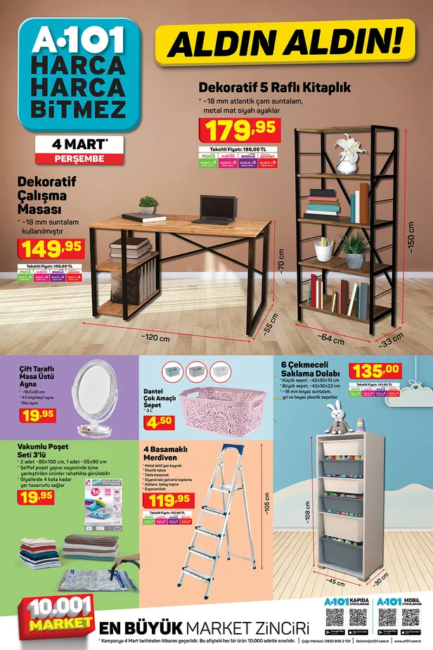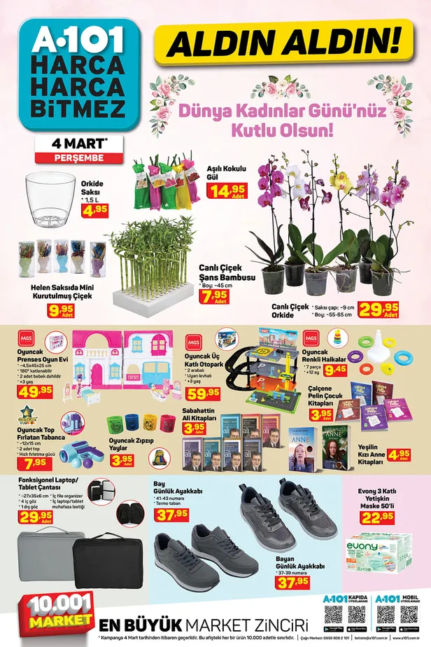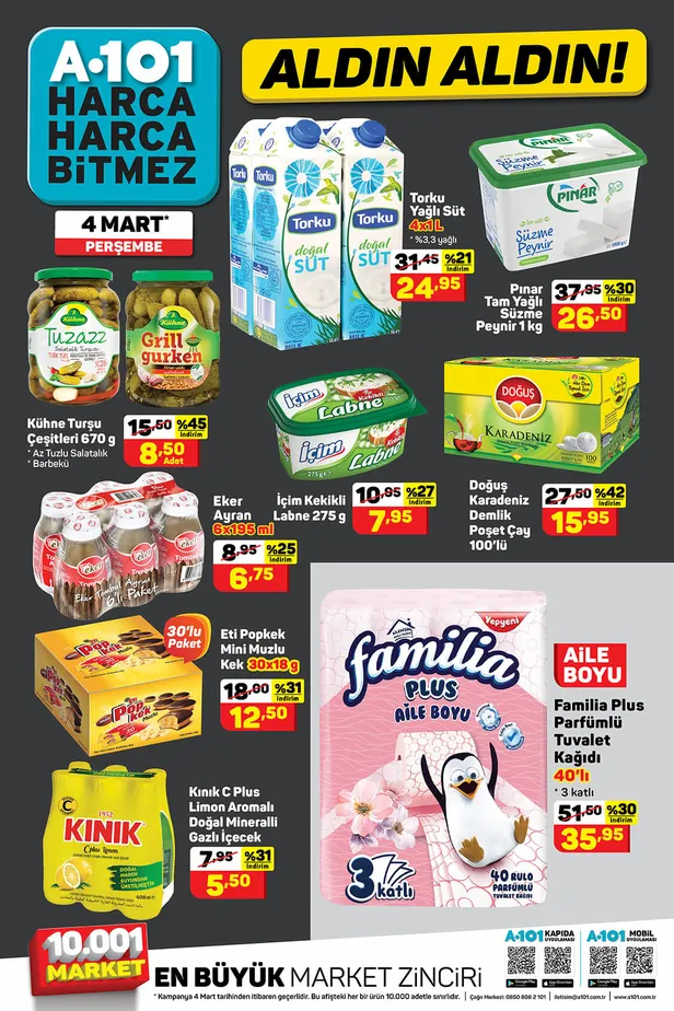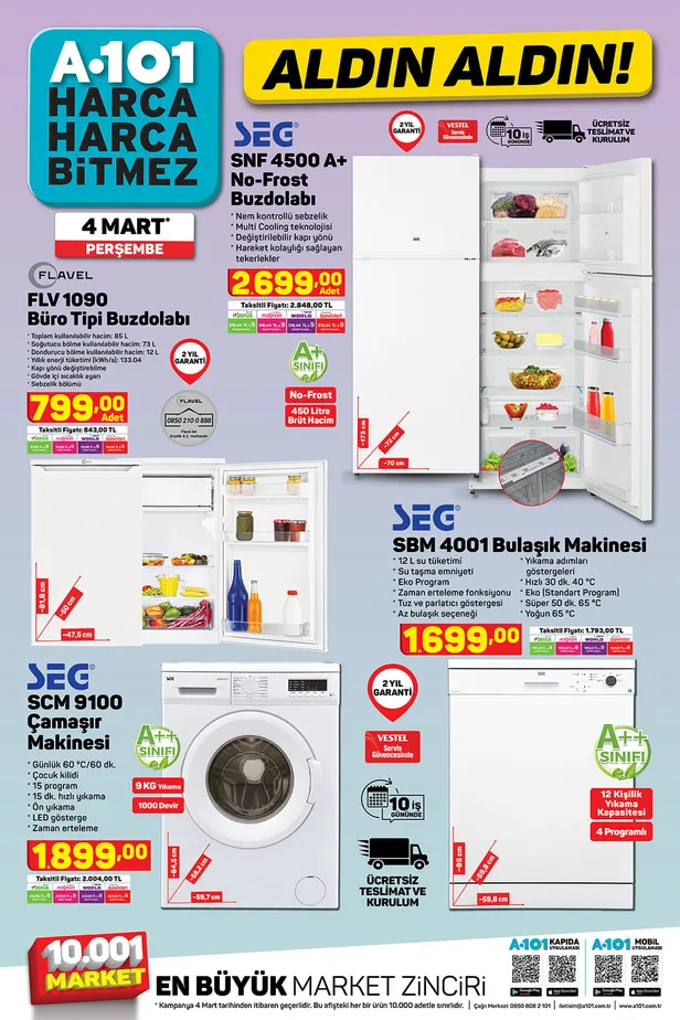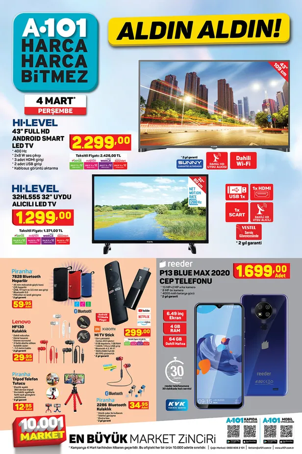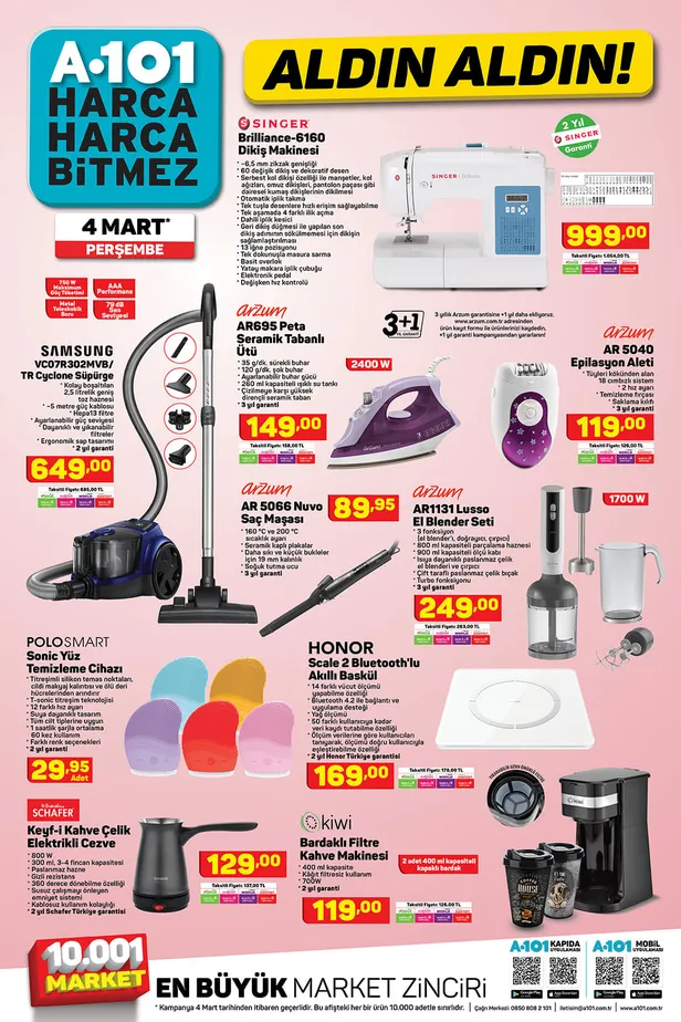 A101 4 Mart aktüel kataloğundaki indirim fırsatları bu sabah raflardaki yerini aldı. Pek çok ürünün dikkat çektiği kataloğda Singer dikiş makinesi, Arzum peta seramik tabanlı ütü, Arzum epilasyon aleti, Schafer keyf-i kahve çelik elektrikli cezve, çift kişilik triko battaniye, Torku yağlı süt, HI-LEVEL android smart LED TV, Reeder P13 Blue Max 2020 cep telefonu ön planda yer alıyor. Peki, A101'de bu hafta neler var? İşte o ürünlerin listesi...