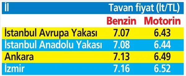 Karara göre; İstanbul Avrupa Yakası'nda benzinin litre fiyatı en yüksek 7.07 lira, motorinin litre fiyatı 6.43 lira olacak.