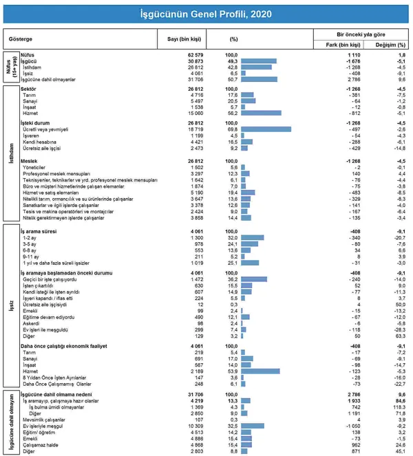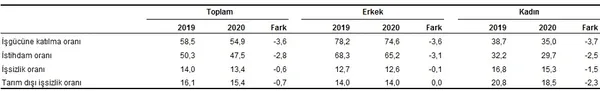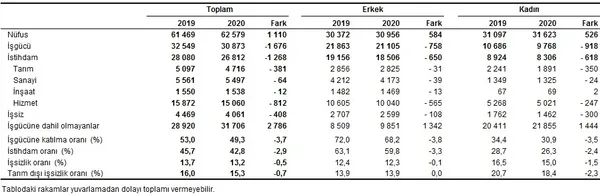Türkiye genelinde 15 ve daha yukarı yaştakilerde işsiz sayısı 2020 yılında bir önceki yıla göre 408 bin kişi azalarak 4 milyon 61 bin kişi oldu. İşsizlik oranı 0,5 puanlık azalış ile %13,2 seviyesinde gerçekleşti. Tarım dışı işsizlik oranı ise 0,7 puanlık azalış ile %15,3 oldu.