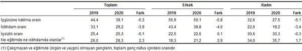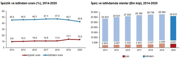 İstihdam edilenlerin sayısı 2020 yılında bir önceki yıla göre 1 milyon 268 bin kişi azalarak 26 milyon 812 bin kişi, istihdam oranı ise 2,9 puanlık azalış ile %42,8 oldu.