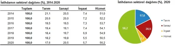 2020 yılında, istihdam edilenlerin %17,6'sı tarım, %20,5'i sanayi, %5,7'si inşaat, %56,2'si ise hizmet sektöründe yer aldı. Bir önceki yıl ile karşılaştırıldığında sanayi sektörünün istihdam edilenler içindeki payı 0,7 puan, inşaat sektörünün payı 0,2 puan artarken, tarım sektörünün payı 0,6 puan, hizmet sektörünün payı 0,3 puan azaldı.