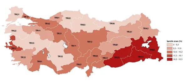 İşsizlik oranı en yüksek bölge %33,5 ile TRC3 (Mardin, Batman, Şırnak, Siirt) iken, işsizlik oranı en düşük bölge %6,6 ile TR82 (Kastamonu, Çankırı, Sinop) oldu.