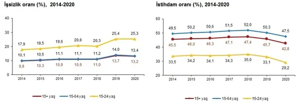 15-24 yaş grubunu kapsayan genç nüfusta işsizlik oranı bir önceki yıla göre 0,1 puan azalarak %25,3, istihdam oranı ise 3,9 puan azalarak %29,2 oldu. Aynı dönemde işgücüne katılma oranı 5,3 puanlık azalışla %39,1 seviyesinde gerçekleşti. Ne eğitimde ne de istihdamda olanların oranı ise bir önceki yıla göre 2,3 puanlık artışla %28,3 seviyesinde gerçekleşti.